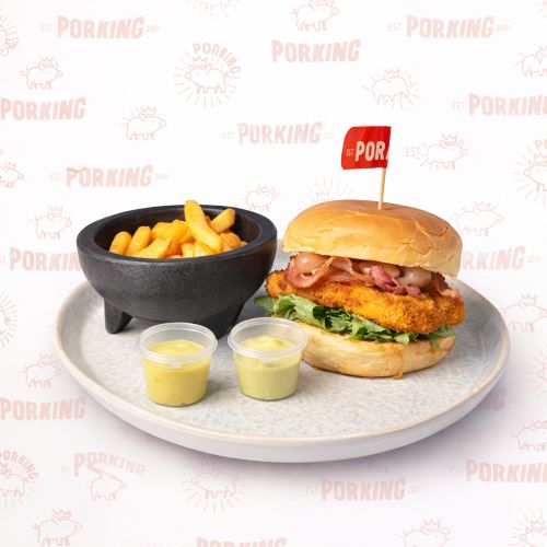 Queso Cheddar, Lechuga, Tocineta Y Aderezo Porking. Con Papas Fritas
