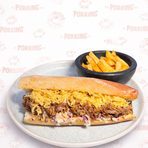 Cerdo Mechado Con Cole Slaw Y Queso Amarillo. Con Papas Fritas