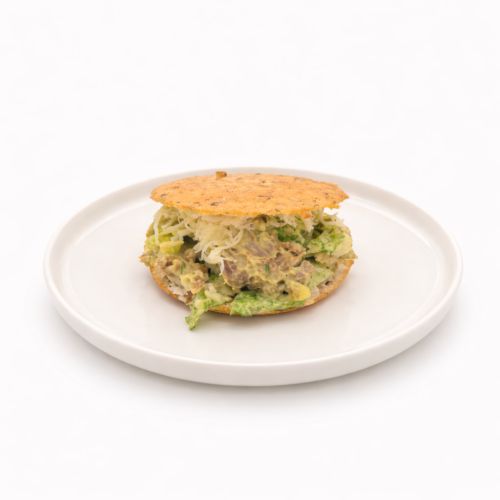 Arepa Tostada Con Pernil, Aguacate, Cebolla Y Aderezo De Ajo Casero