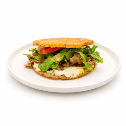 Arepa Tostada Con Pernil, Tomate, Lechuga Y Cuajada Casera